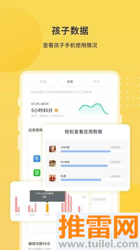详尽记录孩子手机的使用轨迹并生成分析图表,让家长对孩子的习惯一目了然。