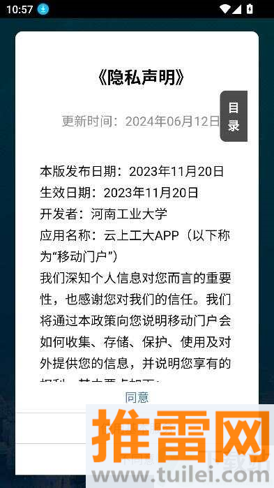 2、打开软件后会提示你阅读隐私条款,这是正常流程,认真看一下内容没问题的话就点同意,不然没法继续往下走。