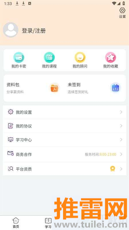 2、打开APP后进入个人中心页面,点击登录或注册按钮开始设置自己的学习账号。