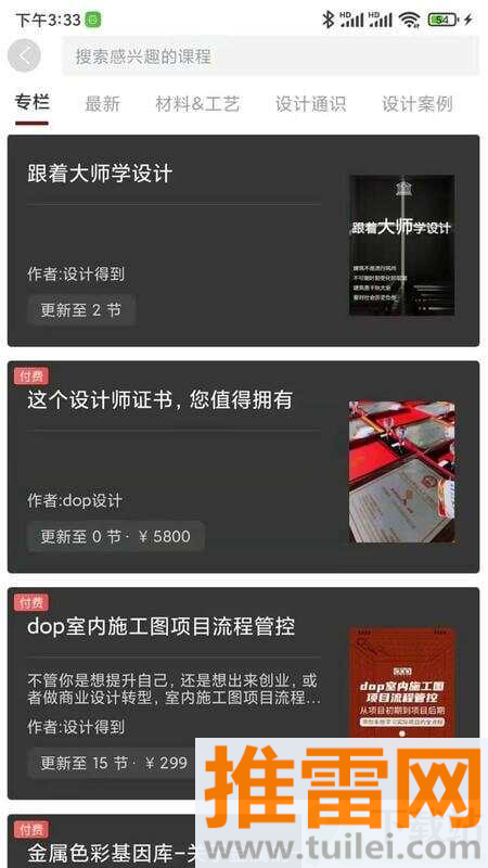 系统化教学视频覆盖CAD施工图到BIM技术应用,既有入门必学的《装饰材料应用指南》,也有资深设计师主讲的《商业空间灯光设计全案》。