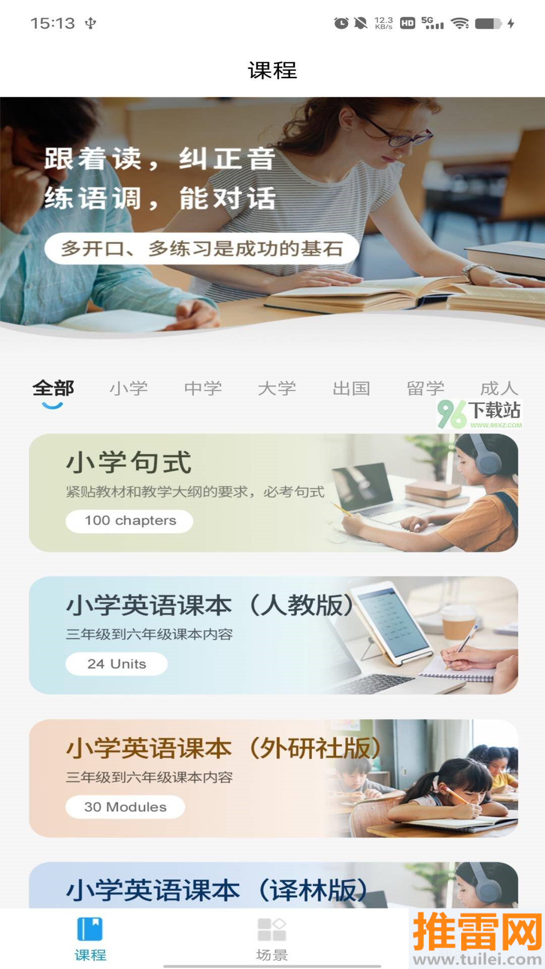 4、登录后回到首页,上面列了各种课程分类,比如旅游英语、点餐用语,选一个感兴趣的点进去就开始练。
