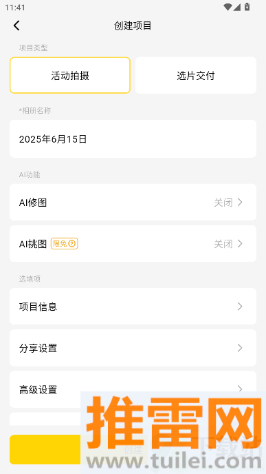 3、选择你要做的项目类型,比如是婚礼跟拍、产品静物还是日常写真,填好拍摄时间、地点、客户信息这些内容。