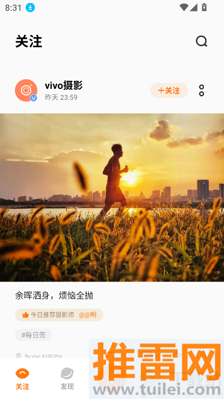 3、在关注页面里能刷到官方推荐和摄影高手发布的作品,可以点赞、留言,也能转发给朋友看。