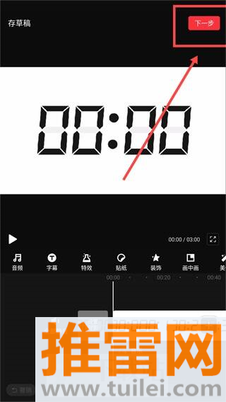 3、导入视频后,就来到了剪辑页面,在这里,你可以对视频进行各种编辑,比如添加音频、字幕、特效、贴纸、装饰,甚至画中画效果,编辑完成后,点击“下一步”。