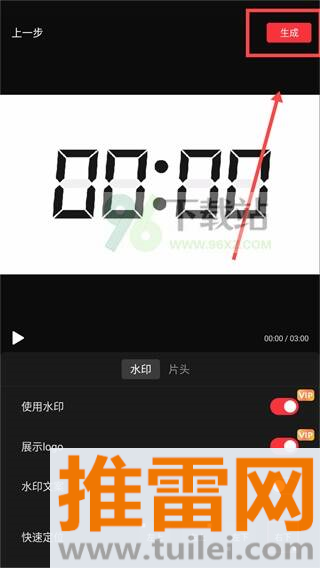 4、最后一步是生成作品,在这个页面,你可以设置水印、logo、水印文字,以及快速定位等,设置完毕后,点击右上角的“生成”按钮,你的视频作品就制作完成了。
