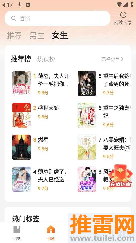 比趣小说APP是个专门看小说的手机应用,不收钱,打开就能用。里面的小说多得数不过来,各种类型都有,玄幻、都市、言情、穿越、宫斗、历史这些全包了。新书更新特别快,早上发的剧情,中午就能刷到。界面干干净净,字大看着不费眼,点几下就能找到你想追的书。它也不乱推广告,看小说的时候挺踏实,适合每天坐地铁、吃饭、睡前拿出来翻几页。收藏的书存进书架,换手机也不丢进度,用起来省心。