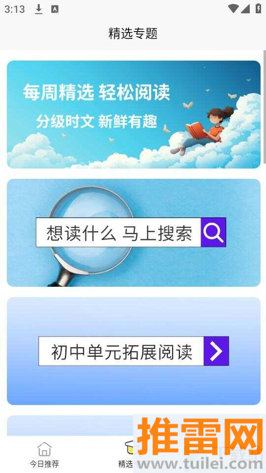 无类阅读这款APP,打个比方说,就是专门为咱们国内从小学到大学的学生,甚至是成年英语爱好者做的一站式英文阅读工具,它不搞花里胡哨的包装,也不搞一堆用不上功能,就是踏踏实实让你每天能读懂一篇原汁原味的英语文章,系统会先摸清你的实际水平,然后推适合你看的内容,不会太难让你看不下去,也不会太简单浪费时间,文章来源挺靠谱,有不少是中高考常见题源刊物的原稿,不是随便从网上扒的,关键是它把查单词、分析句子、听发音这些学习动作都集成得特别顺手,读着读着就学进去了,根本不用切换别的软件,而且每天打开都能碰上新鲜话题,今天聊聊环保科技,明天说说国际新闻,不知不觉就把词汇量和语感给提上来了,特别适合想靠长期积累把英语搞明白的人。