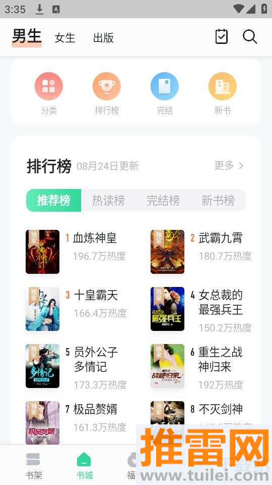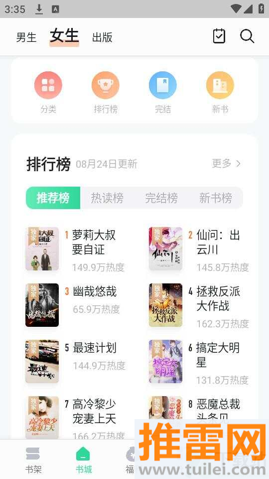 3、首页有各种分类,玄幻、都市、言情、悬疑都有,随便点一个进去就能浏览推荐的小说列表,不愁没书看。