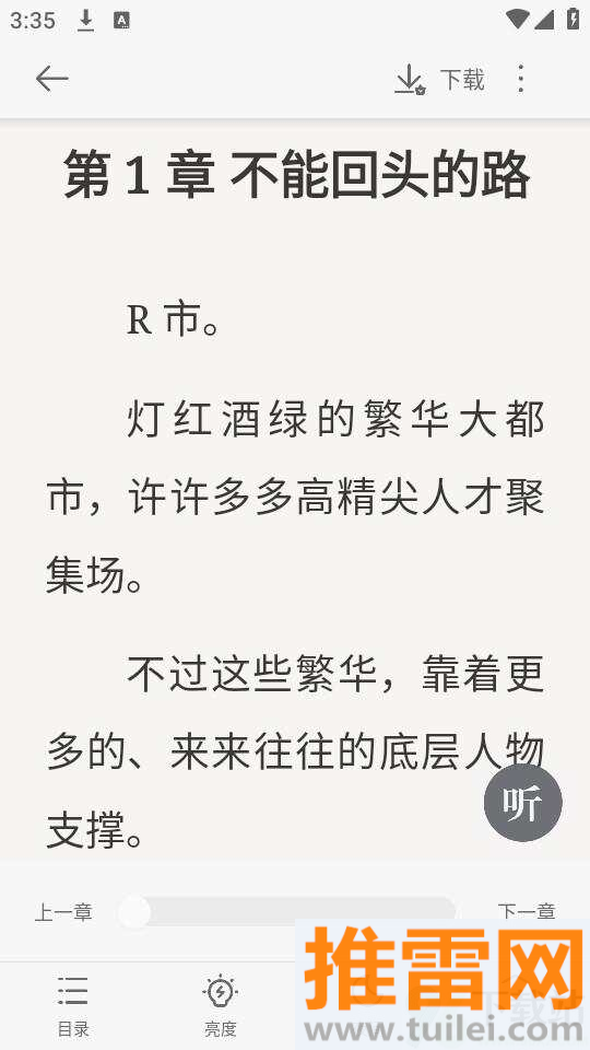 5、看书时点一下中间区域,弹出菜单后选下载按钮,可以把当前章节或整本小说存下来,以后不用联网也能读。