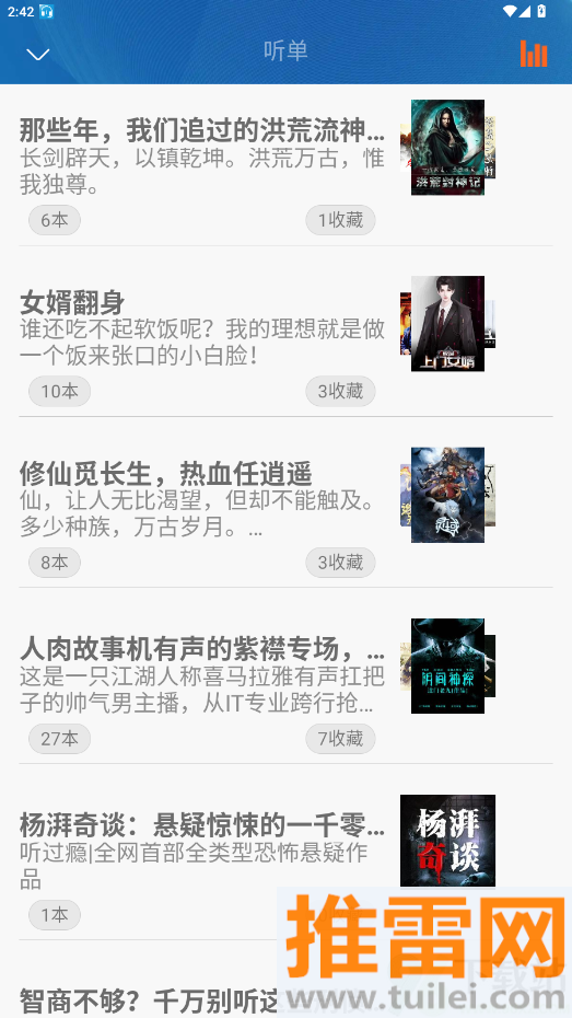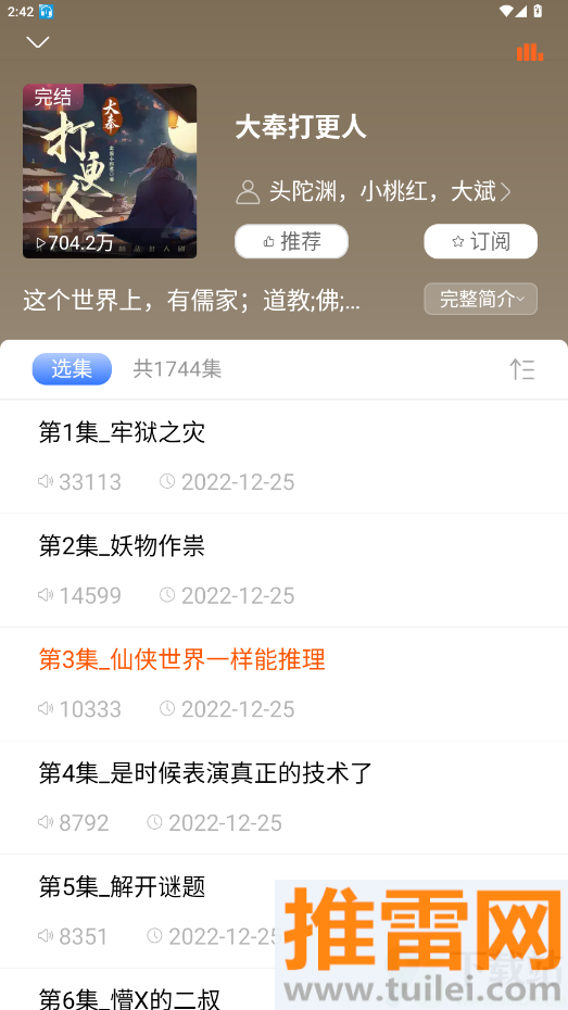 3、找到目标书籍后点击进入详情页,从中挑选要听的章节或选集,点一下就开始播放了。