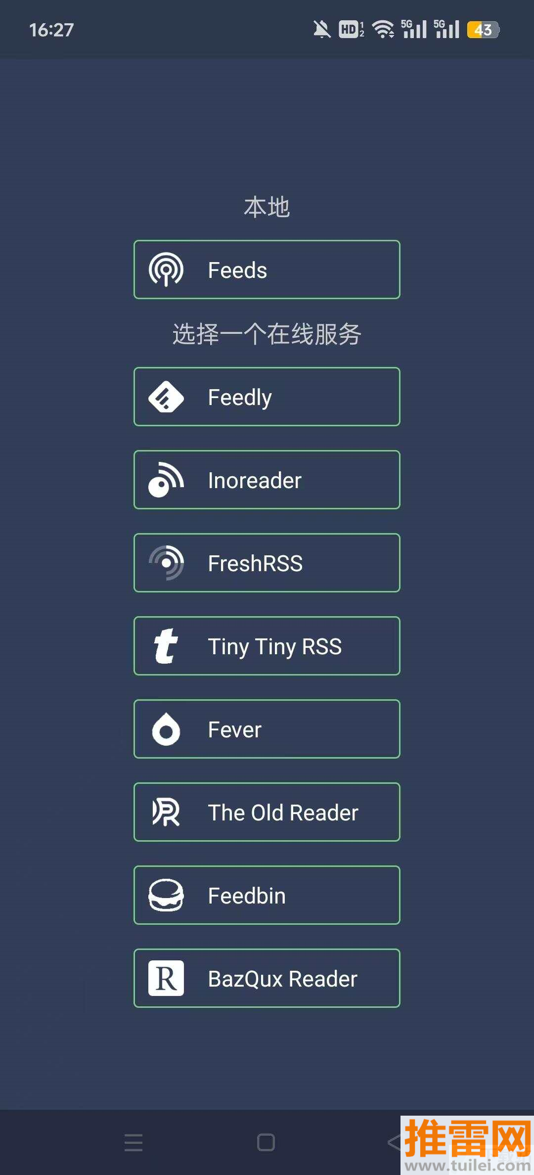 1、安装完成后打开FocusReader rss,选择你要绑定的在线服务账号,推荐优先用Feedly,登录后能直接拉取你原有的订阅列表。