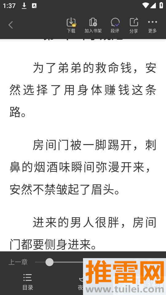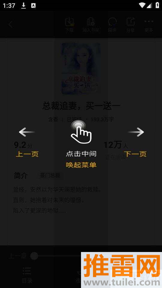 4、轻点屏幕中间区域会弹出功能菜单,里面有字体设置、背景调节、夜间模式等阅读选项。