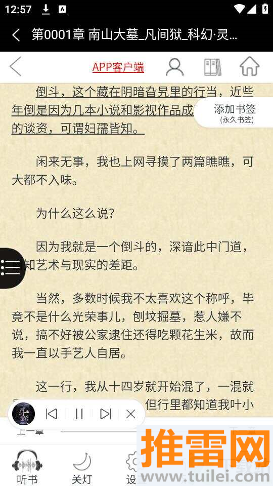 5、在阅读页菜单里选择“听书”选项,就能让手机自动朗读当前章节,还能调节语速和音色,听着很自然。