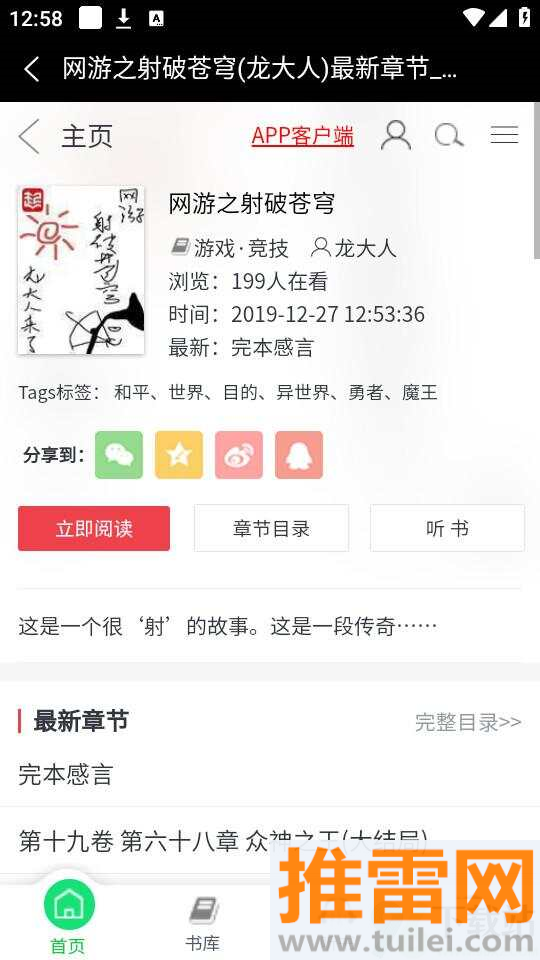 3、找到感兴趣的小说后点进去,直接点封面下方的“立即阅读”按钮,系统就会从最新章节开始加载内容。