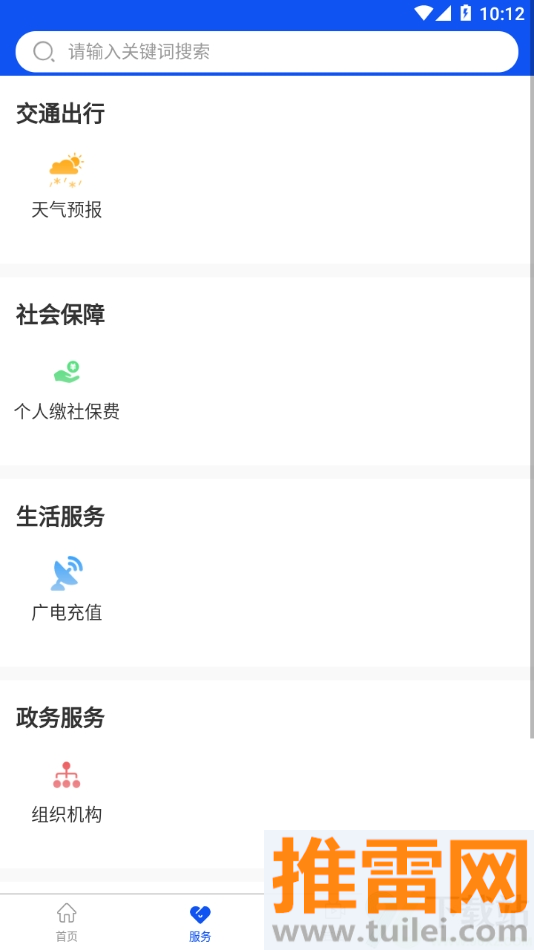 3、点击底部“服务”栏目,能找到天气、缴费、政策查询等功能,分类清楚,找起来不费劲。