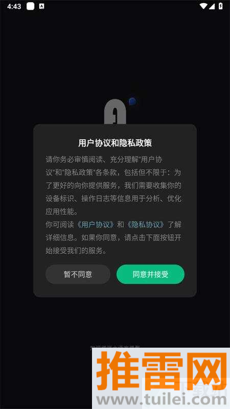 2、打开应用后会跳出用户协议和隐私条款页面,建议花两分钟快速浏览一下关键内容,确认没问题再点同意进入主界面。