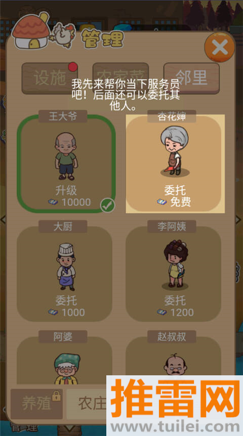 4、农庄做大了忙不过来,就雇人帮忙,浇水、收菜、招呼客人,都能交给员工,你落个清闲。