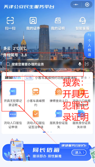 1、下载安装天津公安民生服务平台app,来到首页,点击开具无犯罪记录证明