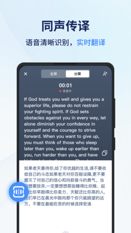 同声传译王还支持同步保存录音文件,用户可随时回放重听。它还可以导入音视频类文件进行翻译,处理速度迅速,准确率高。用户也可以手动输入要翻译的文本内容,一键转换为各国语言,满足用户不同的翻译需求。产品特色功能之一是拍摄所需翻译的文字内容。用户只需拍照,通过智能翻译模块,同声传译王能够迅速给出翻译结果。它还支持原图和翻译结果图片对照查看,方便用户对照校对。