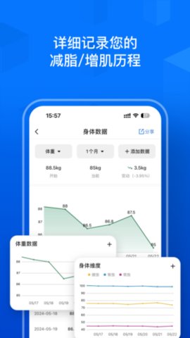2.可视化的进展追踪:所有录入的饮食与运动数据均以图表形式动态呈现,让能量平衡与身体变化趋势一目了然。
