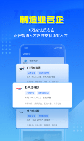 智通人才网的服务对象包括广大求职者和招聘企业,我们提供附近工作的匹配功能,让用户能够找到附近的好工作。而且我们还提供海量高薪制造业职位供用户选择。我们专注于先进制造业的人才招聘,为求职者提供更多高质量的岗位选择,为企业提供更精准的招聘服务。