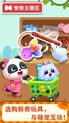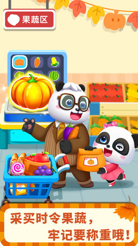 当宝宝采购完毕后,还需要进行付款。这时,应用会向宝宝传递“金钱”的概念,告诉宝宝要想带走商品,就需要用钱来交换。宝宝们可以看到,【宝宝超市】的界面呈现出金黄色调,营造出秋日的氛围,让宝宝们在其中感受到温暖和快乐。超市不仅仅是购物的好去处,也是一本“隐形的教科书”。在【宝宝超市】中,宝宝们可以边逛超市边学习知识。每次采购都有不同的“任务”,宝宝需要根据购物清单进行选购,学会按需采买。宝宝们还可以前往全新的宠物专区,购买宠物用品,并设计宠物的穿搭,让自己的萌宠与众不同。