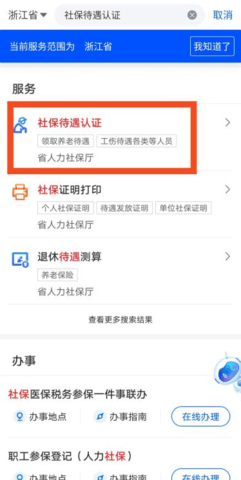 1.登录“浙里办”APP,搜索“社保待遇认证”,点击进入。