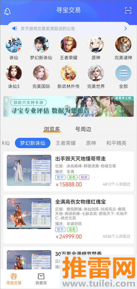游戏资产交易让你焦虑?寻宝网APP,完美世界的官方交易平台,为你的游戏交易保驾护航,这个平台汇聚了各类游戏珍品,从稀有账号到炫酷装备,从独特时装到珍贵宝石,满足你的所有游戏购物欲,你可以在这里找到想要的宝贝,也可以将你的游戏闲置物品变现,平台的撮合服务让交易变得快速又安全,所有商品都经过官方的严格筛选,确保每笔交易都真实可信,寻宝网APP不只是交易,还有估价、拍卖、陪玩等多样化服务,更有“豆乐园”让你在游戏之余享受轻松小游戏和抽奖,赢取的奖品还能转化为余额,感兴趣就下载体验吧。