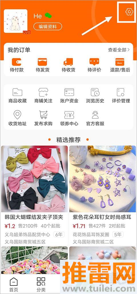 1、打开义乌购APP首页后,首先你需要使用微信或手机号登录,在登录之后,切换到“我的”界面,点击右上角的“设置”图标。