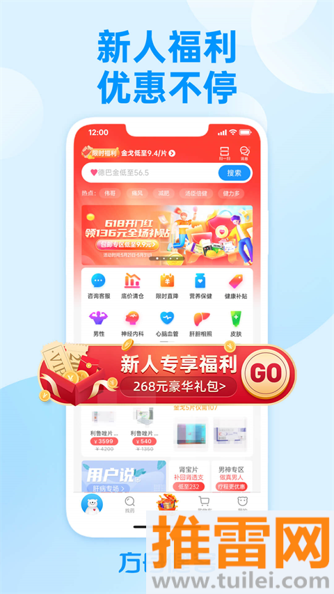 2、打开App,浏览首页推荐药品或者使用搜索功能查找所需药品。