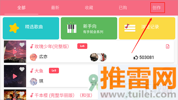2、进“创作”专区看看都有什么歌曲可供参考借鉴,寻找灵感来源。
