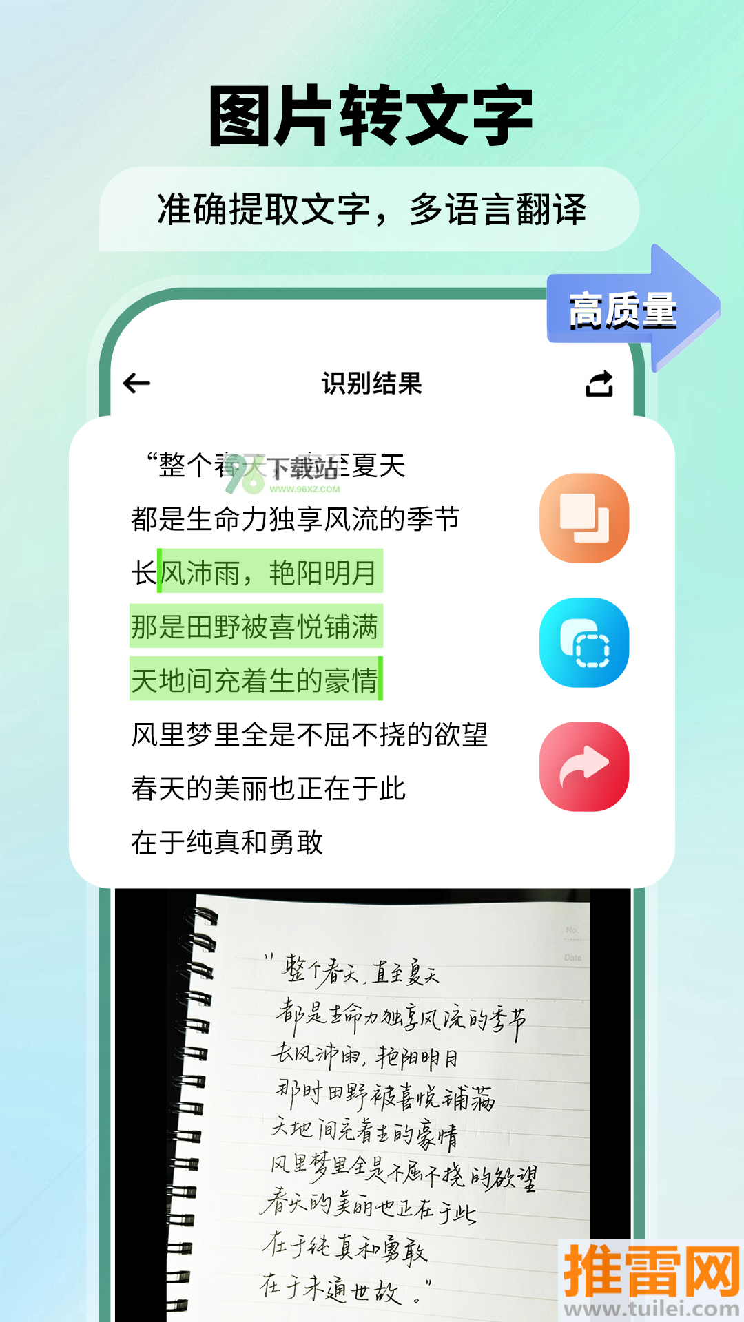 内置OCR文字识别引擎,可以准确提取图片中的印刷文字内容,支持多种语言识别,让纸质资料轻松转为可编辑文本。