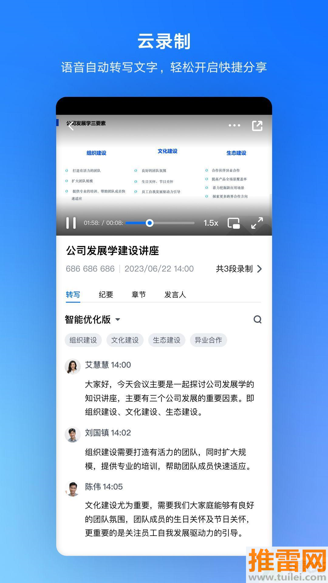 4、智能语音助手可以自动识别不同发言者,生成带时间戳的会议记录,方便后续查找关键内容。