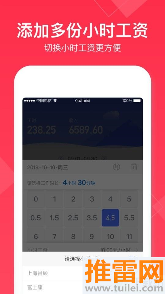 支持设置不同工作地点的时薪标准,切换工作场所时只需轻点对应标签即可。