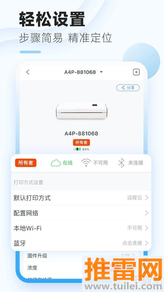 1、首次使用请确保打印机和手机连接同一WiFi网络,或开启蓝牙功能进行配对。
