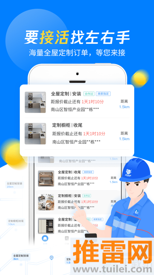 左右手师傅APP是专门给那些做家居安装的师傅们用的,通俗一点说它就是一个接活儿的平台,师傅们可以在上面根据自己所在的地区和擅长的活儿,比如装衣柜、铺地板什么的,来自由挑选订单,从接单、跟商家报价,到干完活儿做个汇报,最后再提现,整个流程都能在这个软件里搞定,它把找活儿、挣米这件事变得很直接,也省去了很多中间的麻烦,对于安装师傅来说确实是个很得力的帮手。