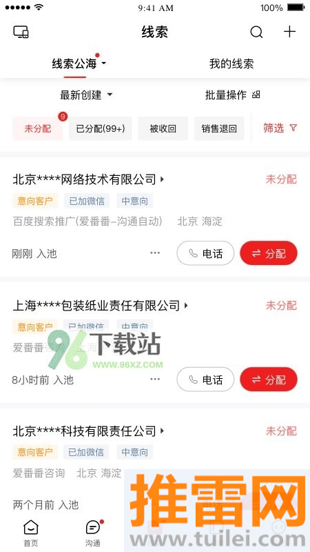 3、在“线索池”中选择需要分配的客户,点击分配按钮指定销售人员负责后续跟进。