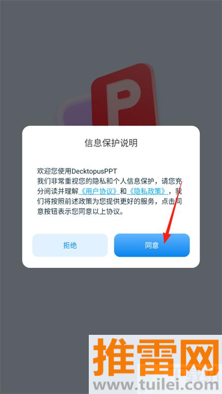 1、下载安装DecktopusPPT应用后打开程序,先阅读并勾选同意用户使用协议再进入主界面。