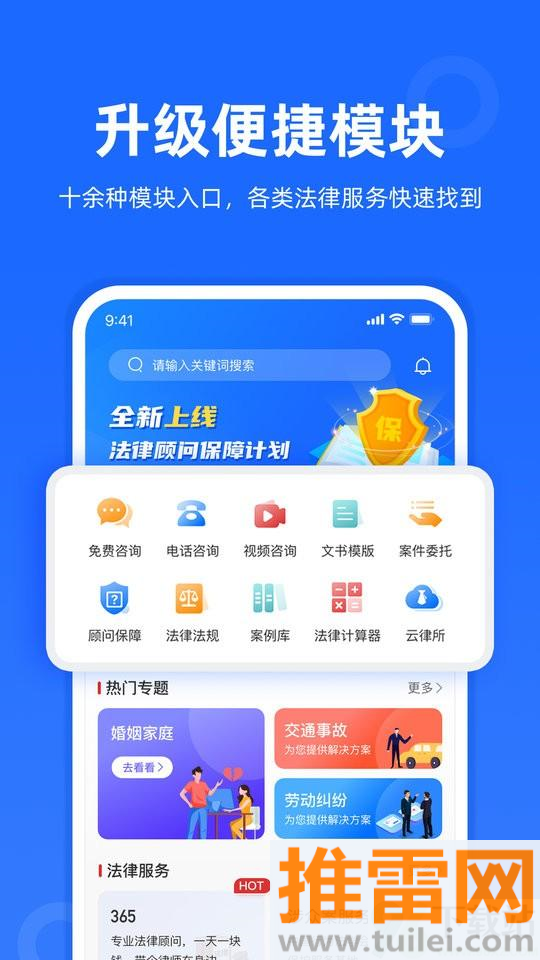 2、在首页搜索框输入关键词或选择相应专题,可以快速找到所需的法律服务项目。