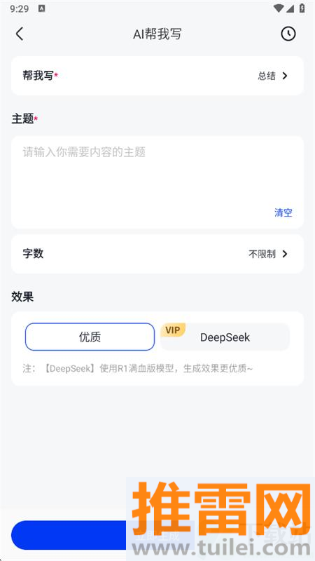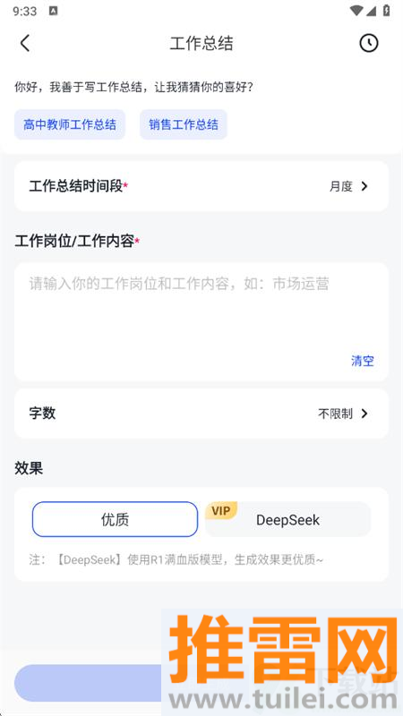 输入个主题,比如要写朋友圈推广文案或者年终总结,选好字数,点一下就出稿,用词自然不生硬,改改就能直接交。