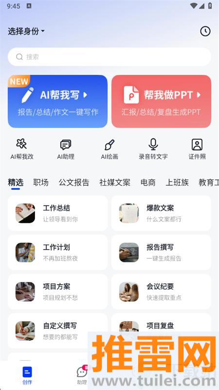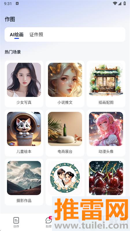 3、主页面上有好几个选项卡,创作、助理、工具都在里面,点进去就能看到所有可用的服务项目。
