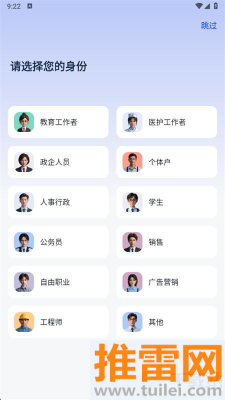 2、进入首页后会让你选身份,比如是学生、上班族还是自由职业者,选好了系统会推荐更适合你的功能。