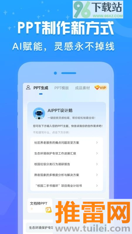 这年头谁还没个临时要交PPT的时候,AiPPT设计鹅app就是专门给人救急用的,不用你会设计,也不用你熬夜改版式,打开手机说你想做什么主题,它三两下就能给你搭出一套像模像样的幻灯片,不管是年底总结、项目汇报,还是课堂作业,它都能顺着你的思路把内容排布清楚,连字体和颜色都配得明明白白,最实在的是模板多得挑花眼,各行各业的案例都有,关键还都是按国内用户的使用习惯搭的,操作逻辑一点不绕,真就跟找个帮手差不多,省心又省力。