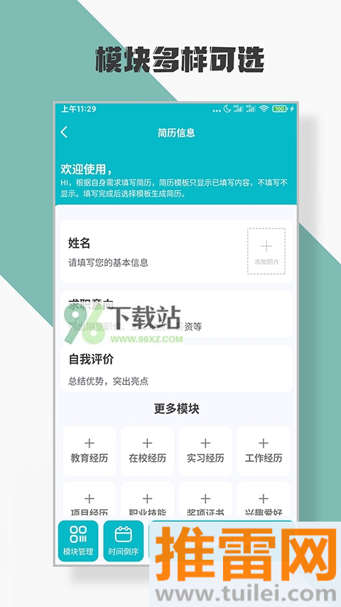 用户可以把自己的姓名、联系方式、学历这些基本资料一项项填进去,系统会自动识别归类,省得自己动手调整位置。