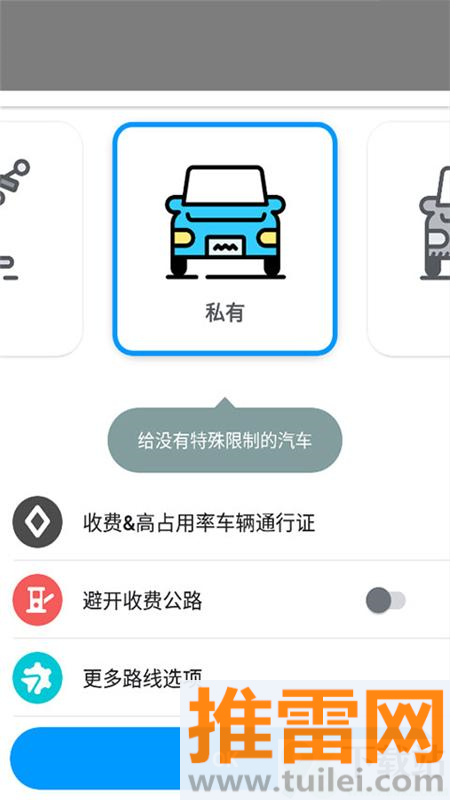 2、选择你要用的出行方式,可以切换成私家车、摩托车或者其他车型,系统会根据车型推荐更适合的行驶路线。