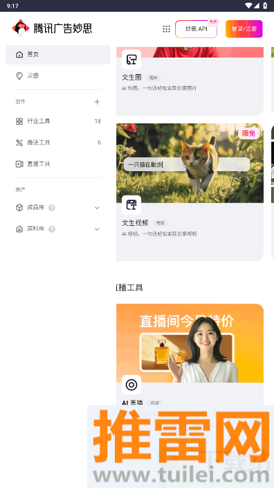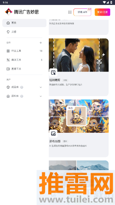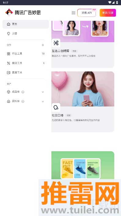 1、下载并打开腾讯广告妙思APP,进入主页面后可以看到左侧列出的各项功能入口。