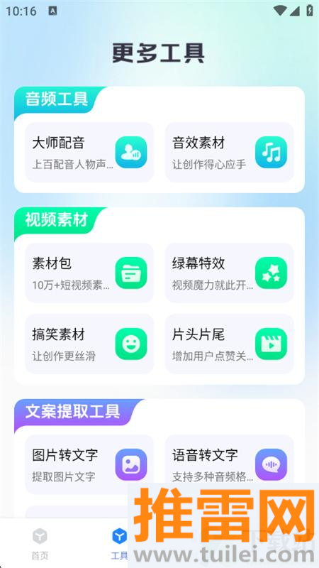 5、工具页里藏着不少实用功能,像AI动图、配音工具、素材库这些都能免费用,做视频不愁没料。