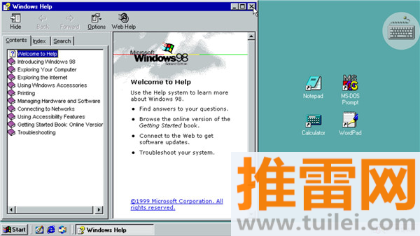 完整模拟Windows 98桌面环境,包括开始菜单、任务栏、系统图标等核心界面元素。
