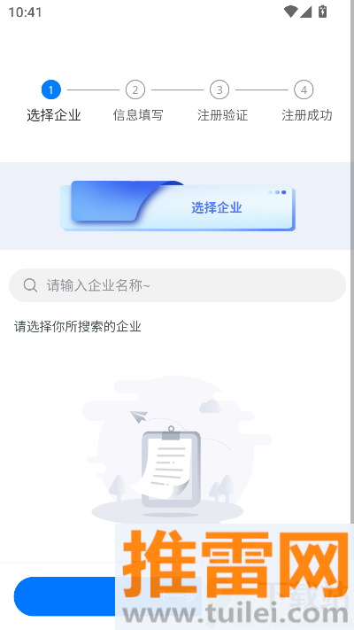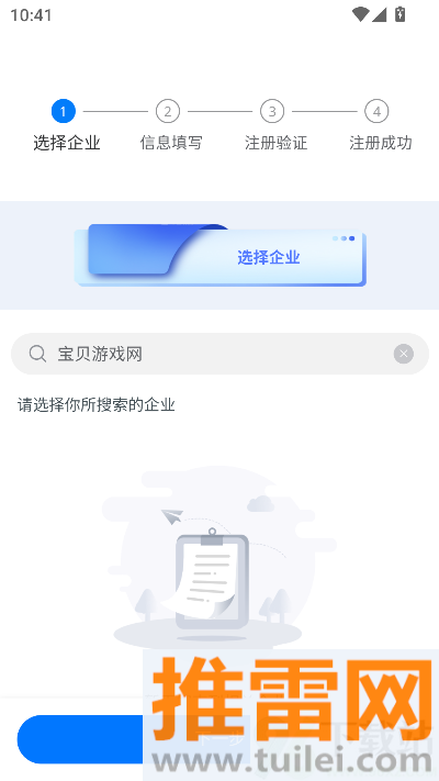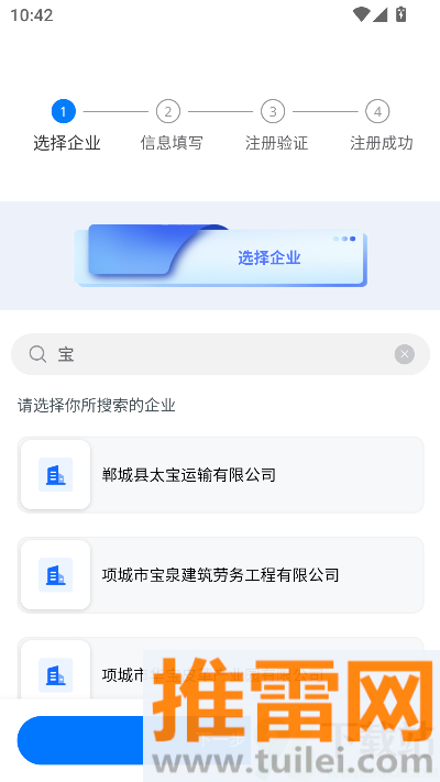 3、注册时需要填写所属企业信息,在搜索框里输入公司名称关键词,系统会列出匹配结果,从列表中选对你的单位再继续下一步操作。