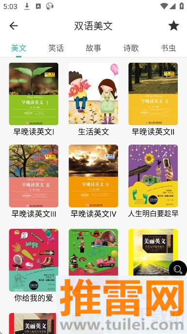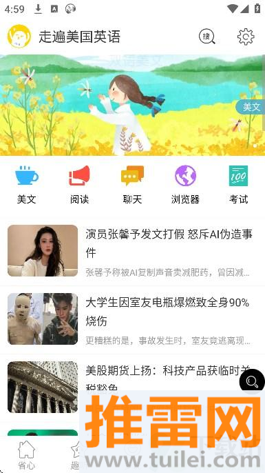 2、切换到“阅读”页面可以浏览中英对照的文章,包括美文、新闻和小说节选,遇到不懂的词直接点击就能查意思,方便随时积累词汇和句式。